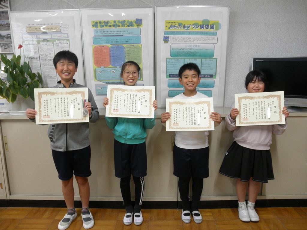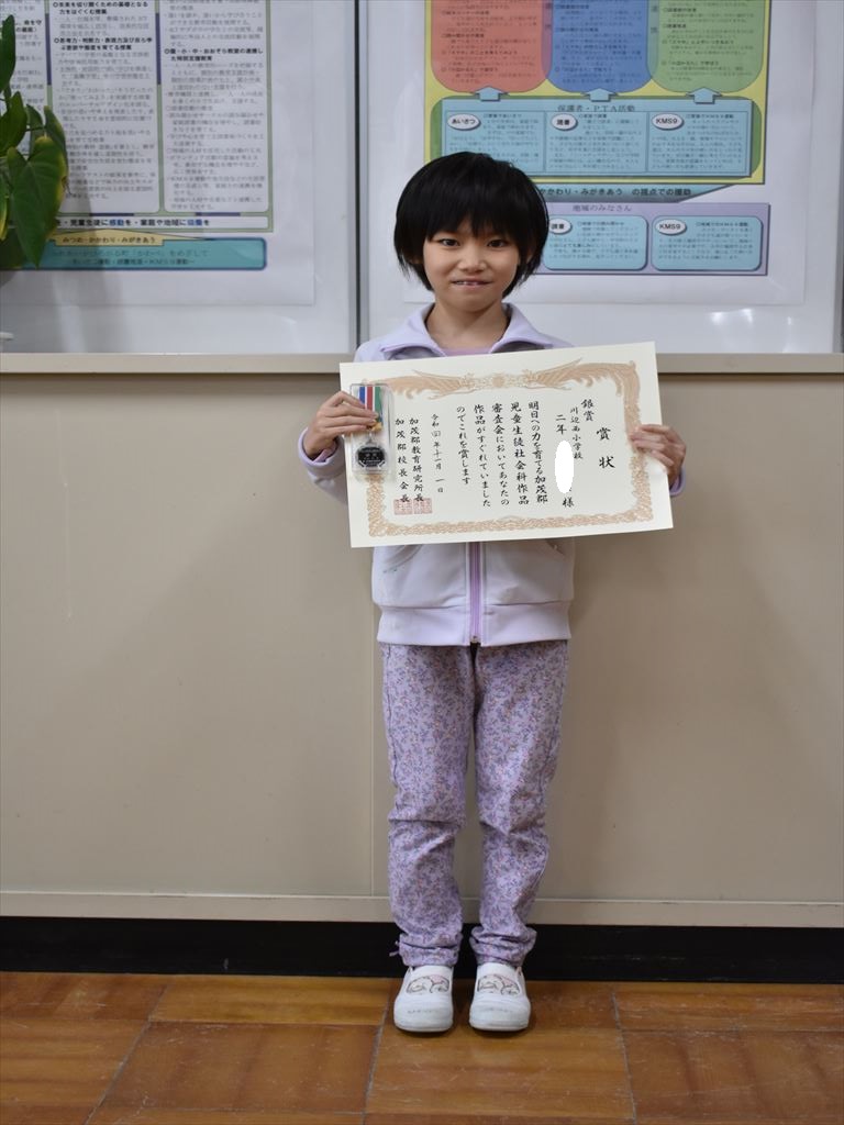 「加茂郡小中学校 社会科作品展」で力を発揮し、入賞を収めた西小学校の児童を紹介します。銀賞2名、銅賞3名の総勢5名です。5名は、夏休み中に時間をかけて研究や調査に取り組み、その結果をまとめ、見事に入賞を果たしました。おめでとうございます。