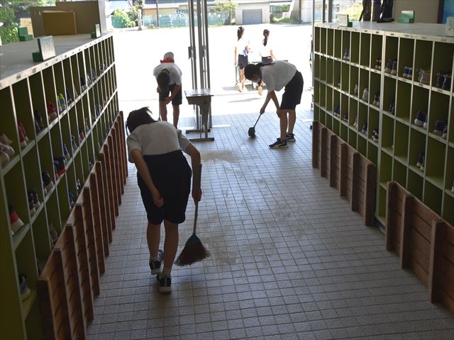 玄関掃除の6年生が意欲的です。砂を一生懸命掃く姿には感心させられます。6年生のがんばりが伝わってきます。