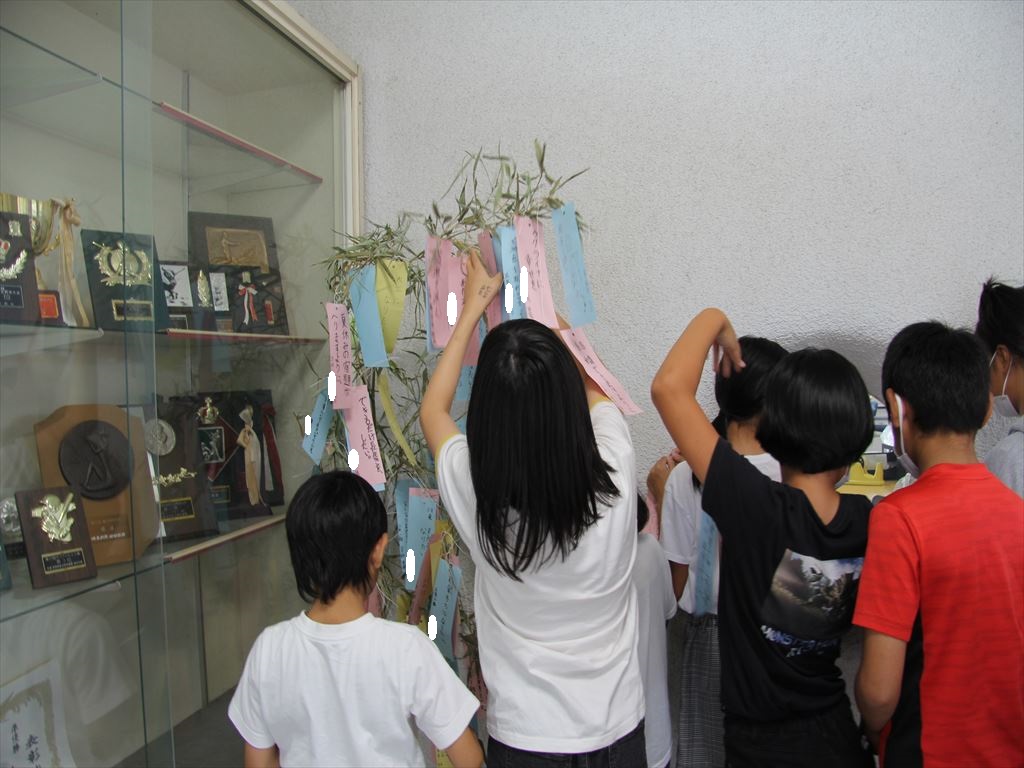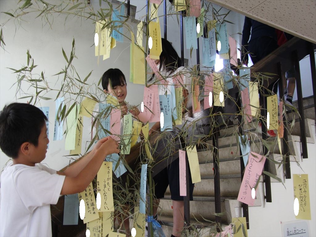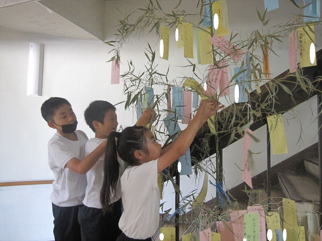 児童会が準備してくれた短冊に、全校児童がそれぞれの願いを書き、笹につるしました。
