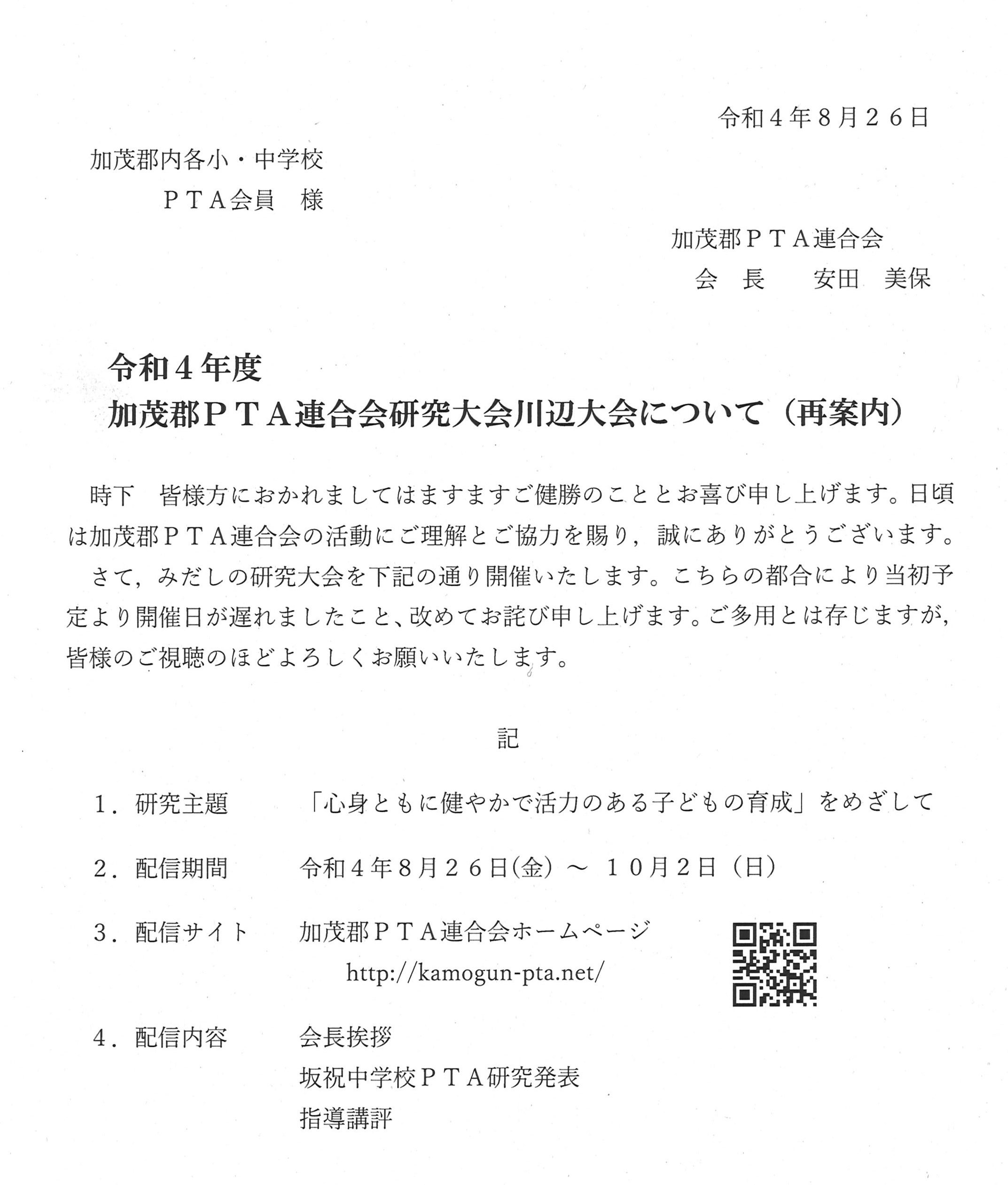 令和4年度の「加茂郡PTA連合会研究大会」が以下のように動画配信により実施されます。ご覧いただき、アンケートへの回答にご協力いただけましたらありがたいです。よろしくお願いいたします。