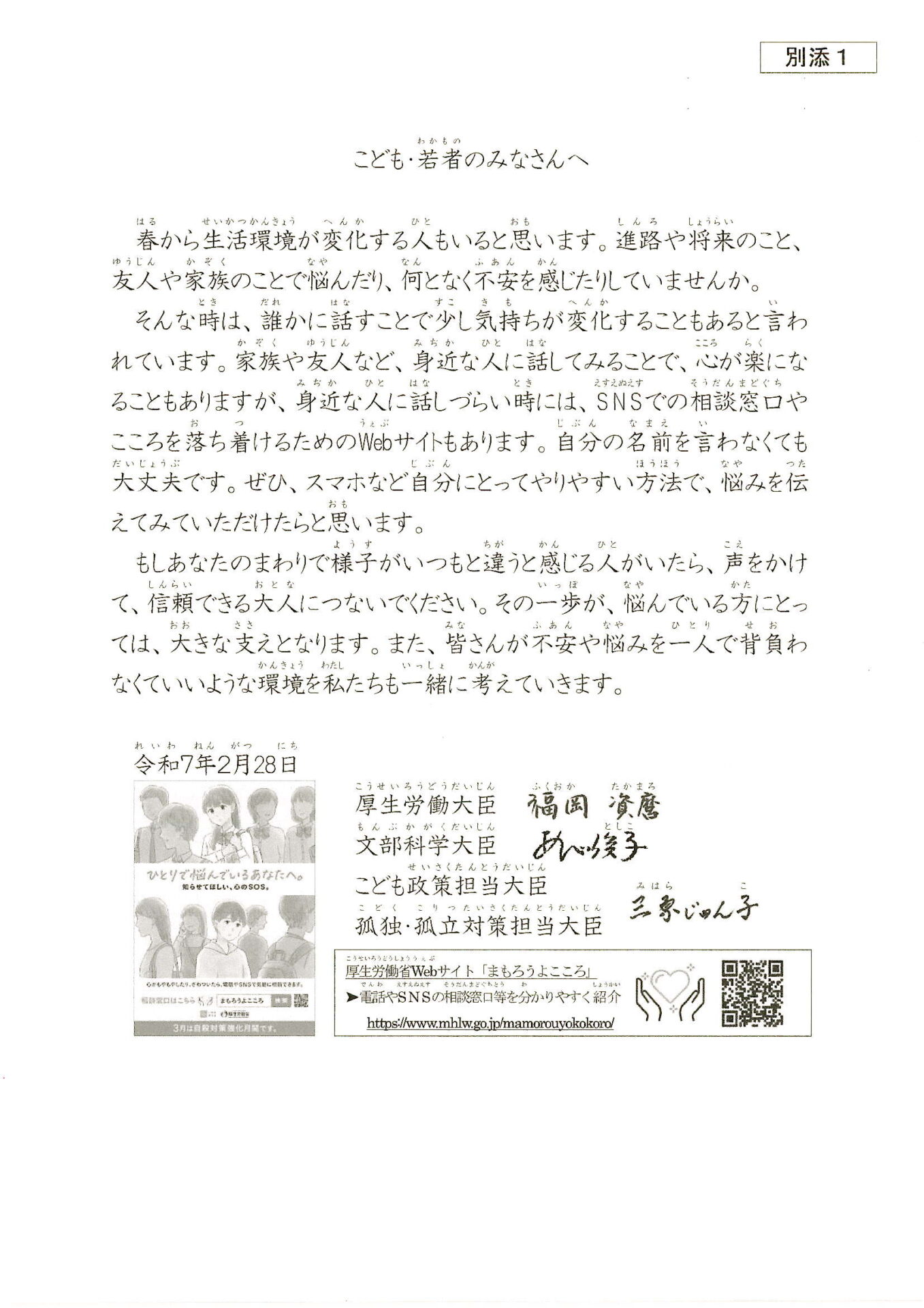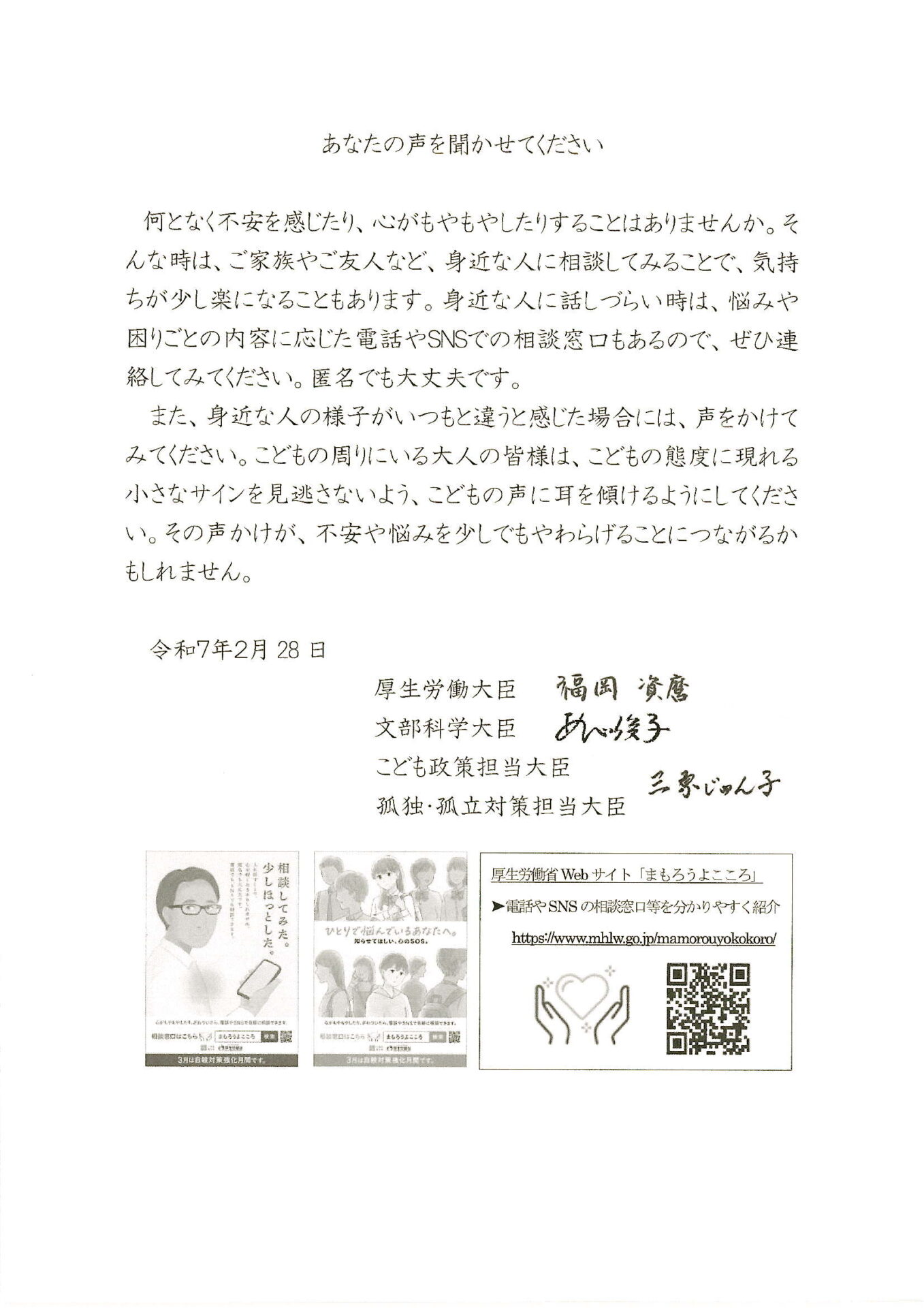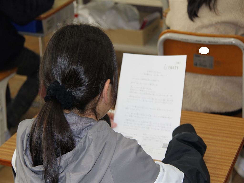 文部科学大臣からの手紙をみんなで読みながら、困ったとき、悩んだときにどうするとよいのかを担任と一緒に確認しました。