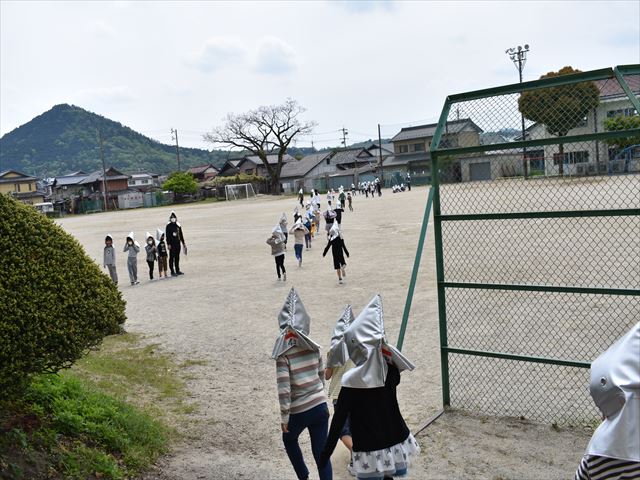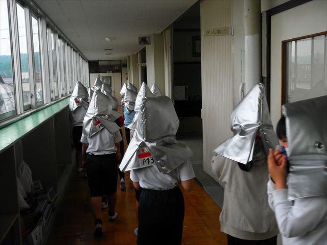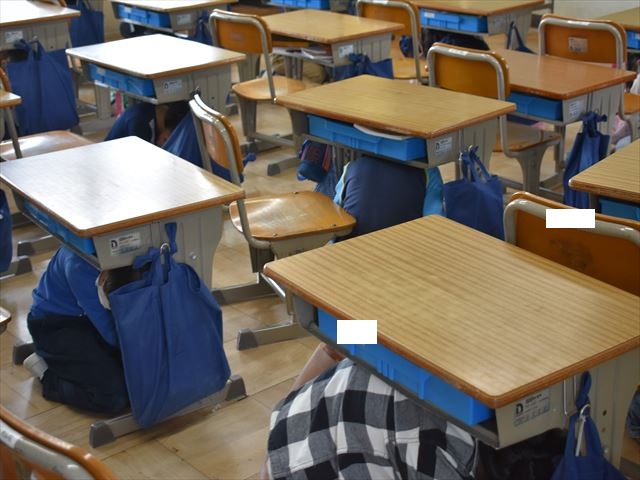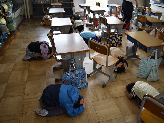 そして、実際に訓練放送を流し、シェイクアウト後に、避難経路を確認しながら運動場に避難するという想定で行いました。避難するときに廊下や階段で密になることを避けるため、1年生以外の学年は、並んで避難を始めるところまで行いました。1年生ははじめての経験のため、運動場に実際に避難しました。