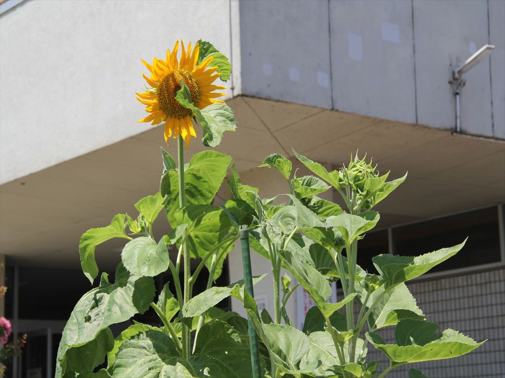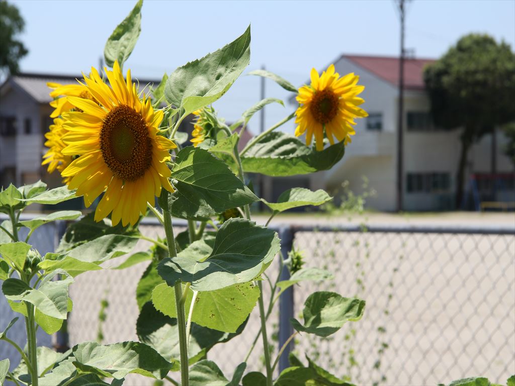 昨年度に引き続き、本年度も地域の方からいただいた「はるかのひまわり」が、川辺の土からエネルギーをもらい、太い茎を伸ばし、夏休み中にきれいに花開きました。