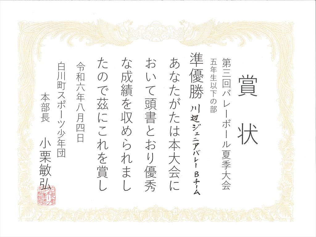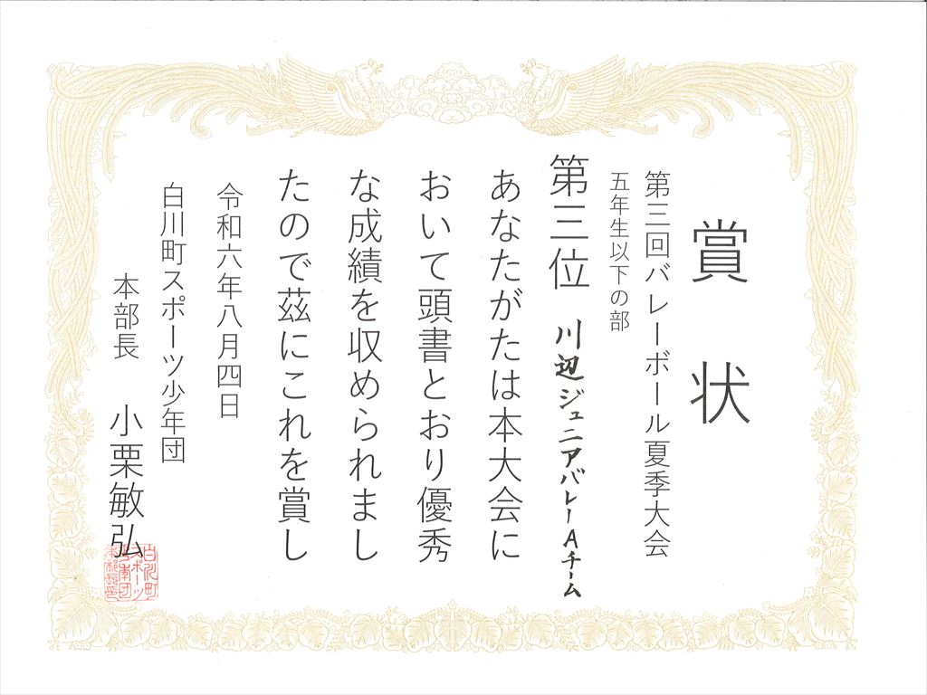 川辺ジュニアバレーAチーム、Bチームのみなさんが、第3回バレーボール夏季大会で優秀な成績を収めました。おめでとうござます。