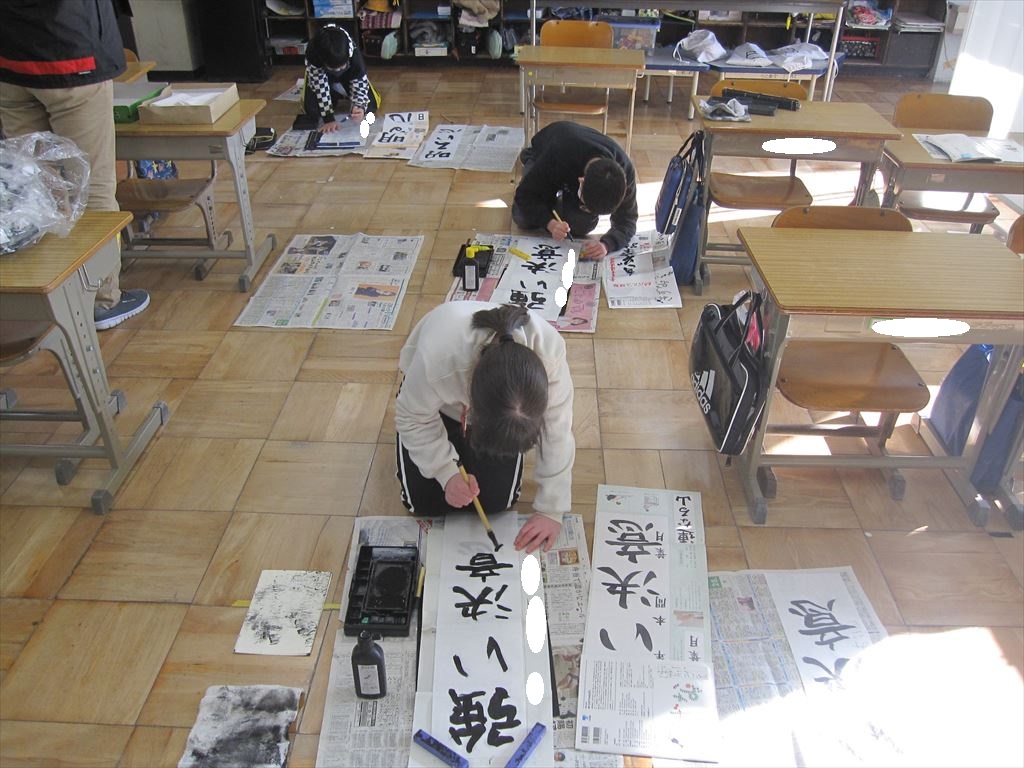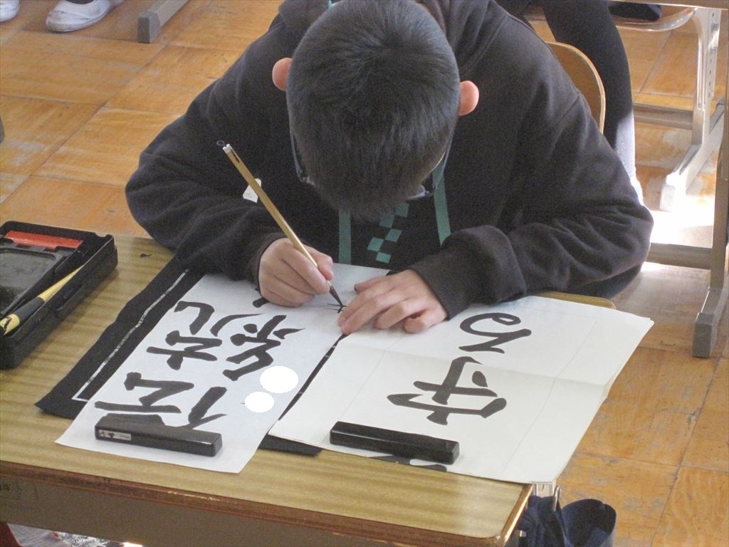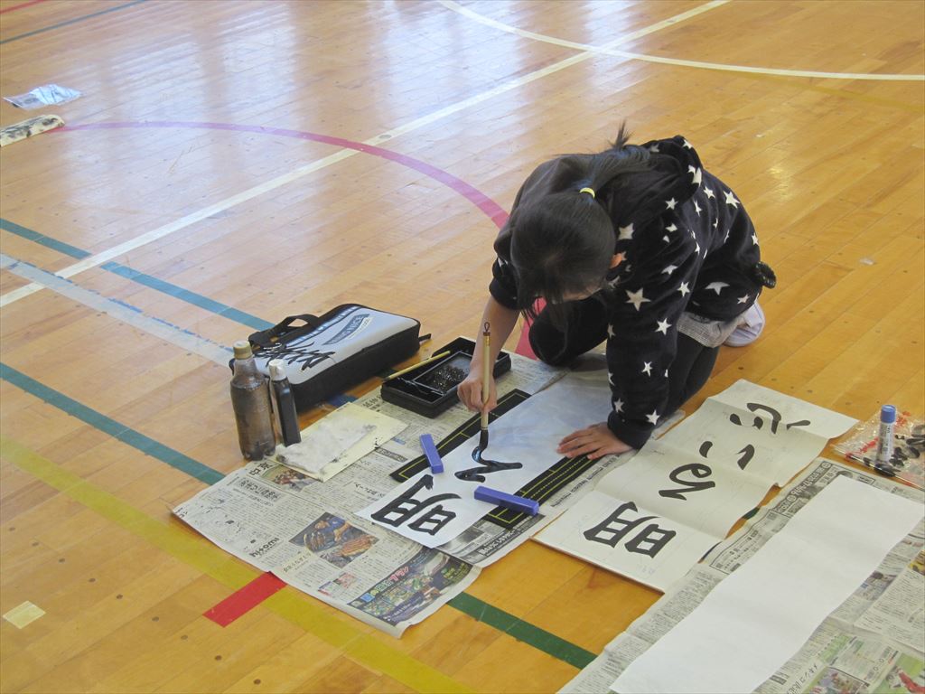 1月11日(水) 学年ごとに書初め会が行われました。冬休み中に家で何度も練習し、その成果を発揮しました。