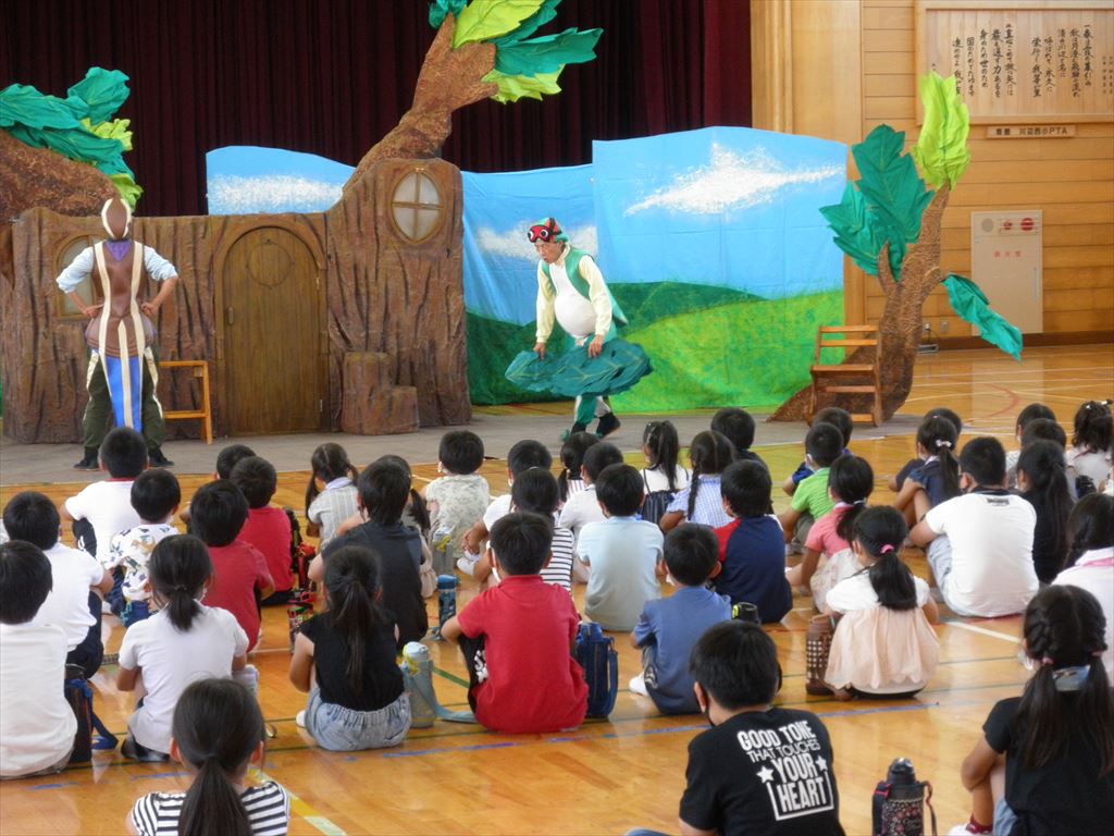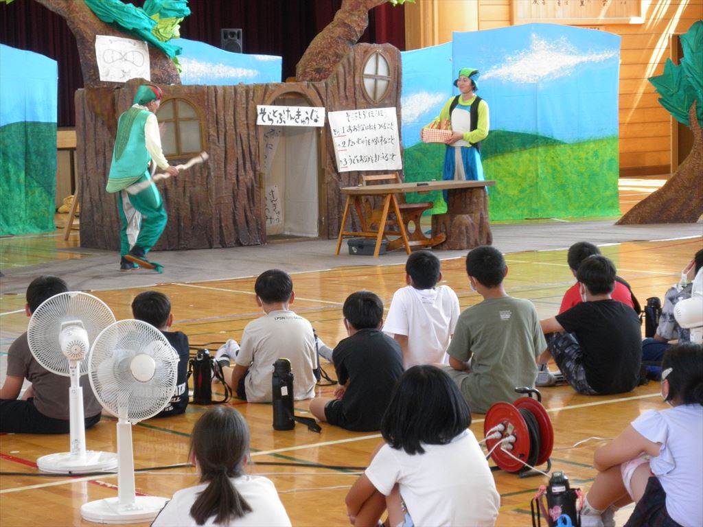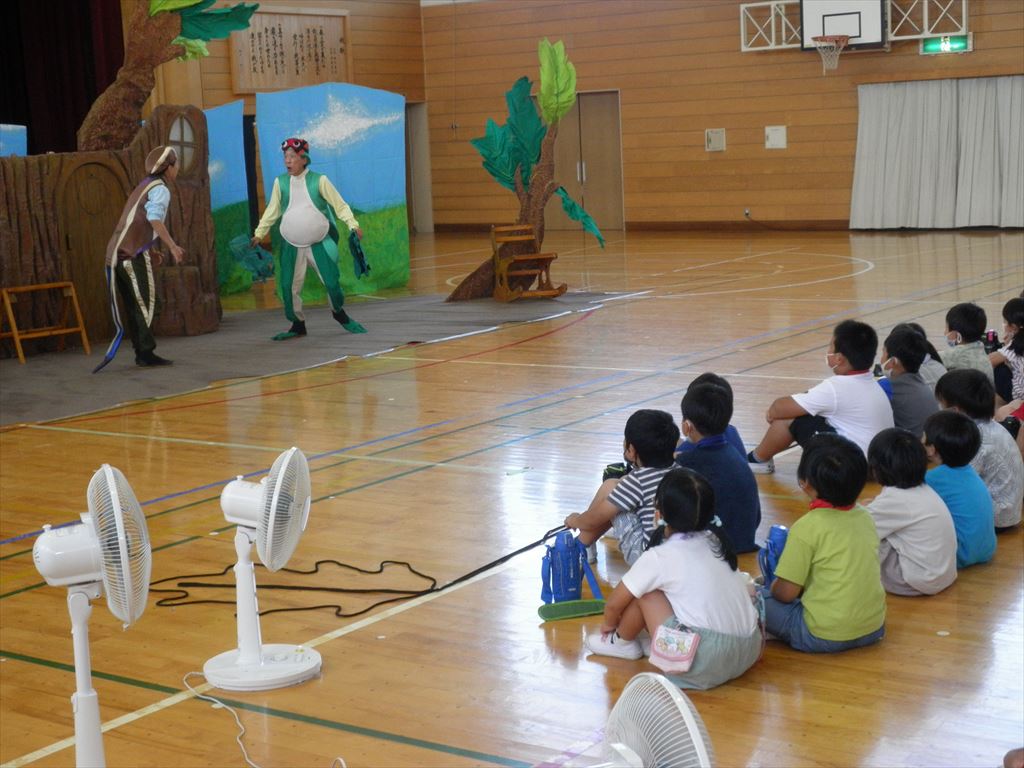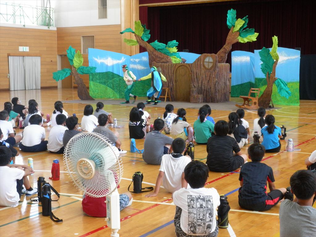 午前は1年生から3年生、午後は4年生から6年生に分かれて、感染対策と熱中症対策をしながら劇を鑑賞しました。