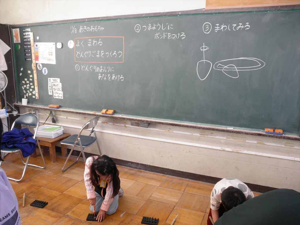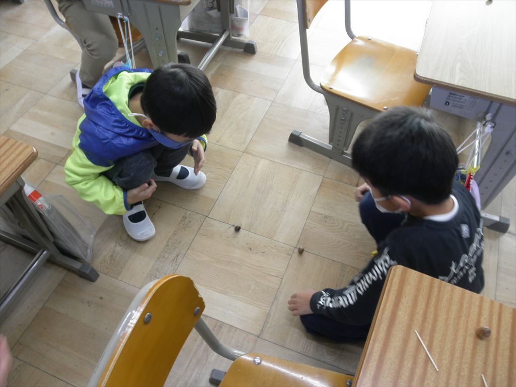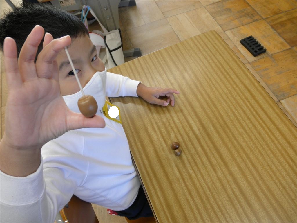 自分で拾ってきたどんぐりに穴をあけ、爪楊枝を差し込みボンドで固め、「どんぐりごま」が完成しました。