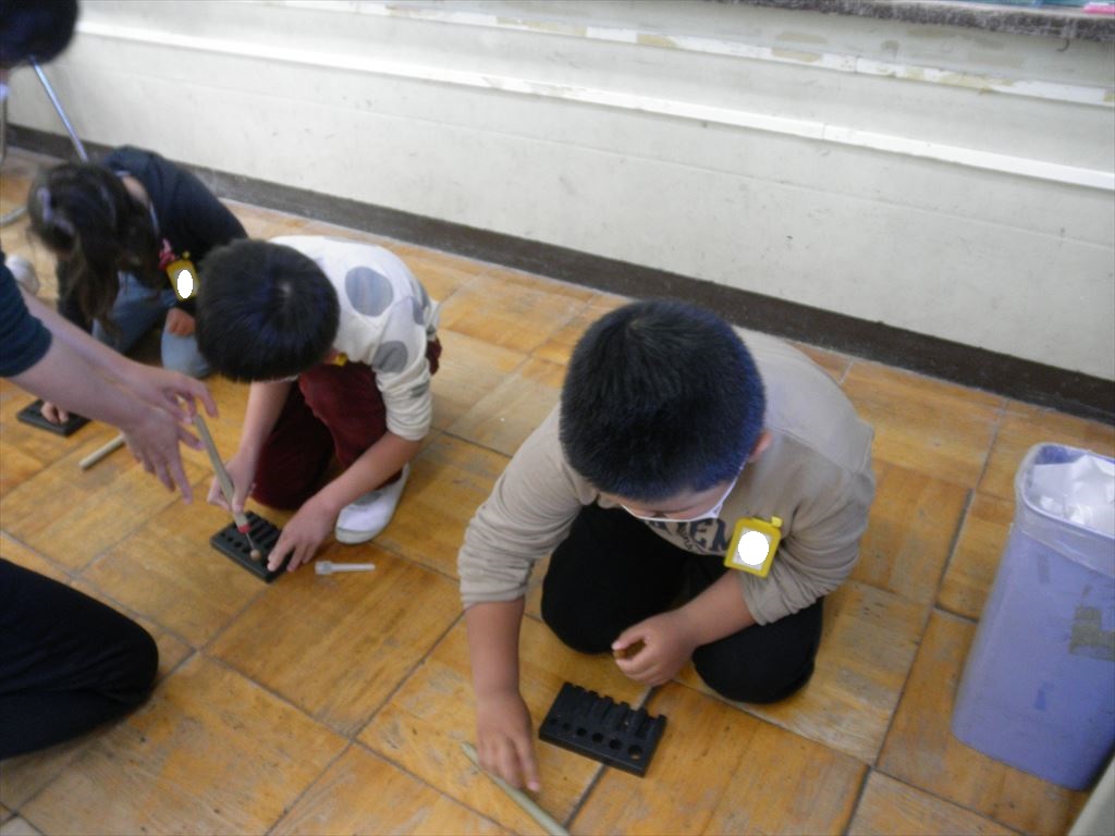 1年生が、11月8日(火)の「秋見つけ」で拾ってきたどんぐりを使い、秋のおもちゃを作りました。
