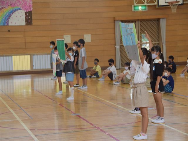 朝の活動時間を使った1年生を迎える会が続いています。22日は2年生、23日は3年生が発表しました。両学年とも1年生に知ってほしいことをクイズ形式を使って発表しました。1年生は、笑顔をこぼしながら発表をみていました。