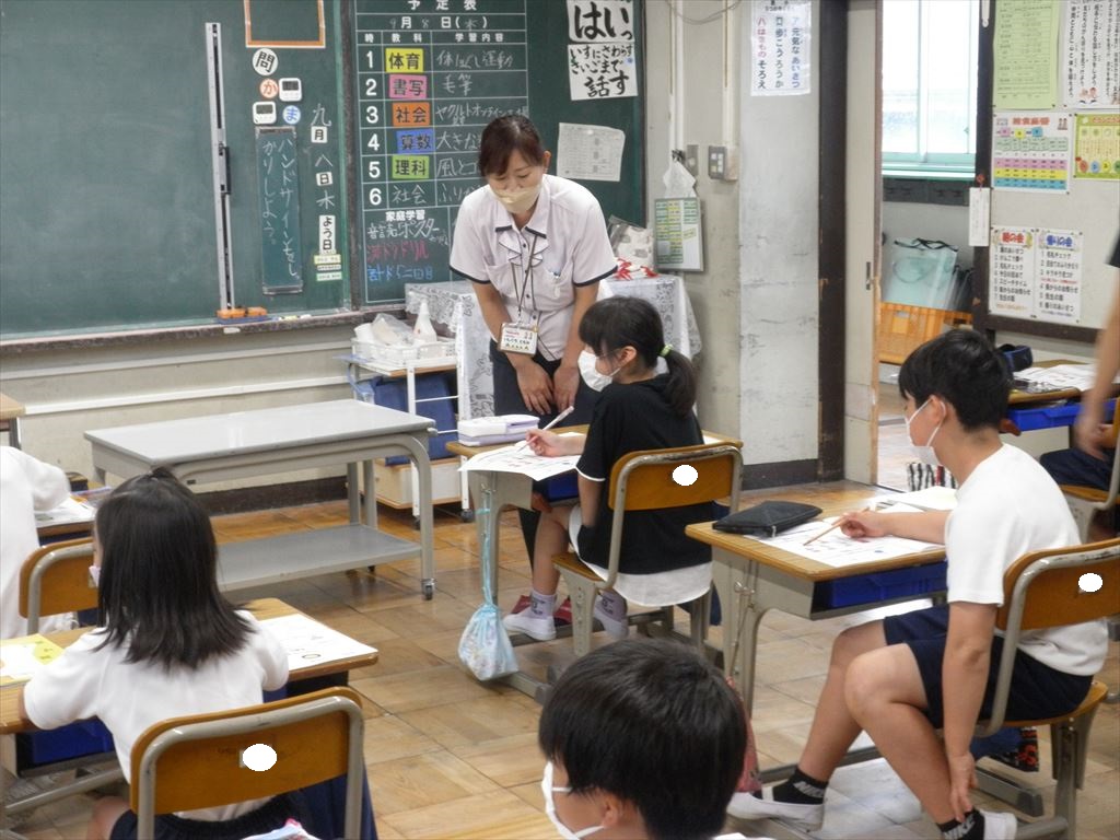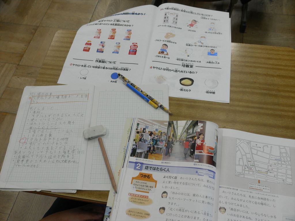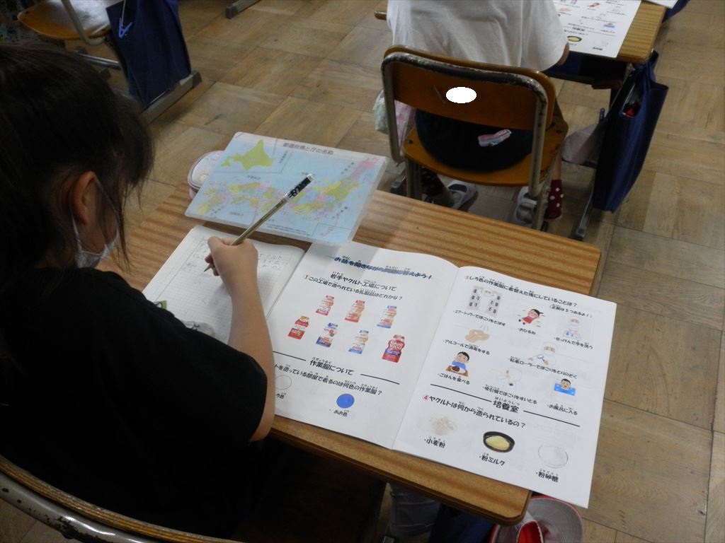 オンラインの画面については、撮影禁止ですので写真には写っていませんが、子どもたちはモニター越しに工場の様子を説明してもらい、ノートや資料に書き込みました。
