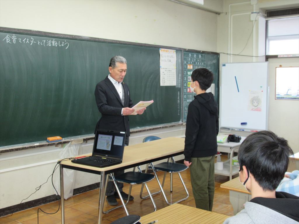 今回は、6年間の食に関する授業の集大成として、自分たちが学校で学んだ食育の話題を家庭内で提供し、食に関する正しい知識と望ましい食習慣を広めるために、6年生全員に「家庭の食育マイスター」の委嘱状を渡しました。