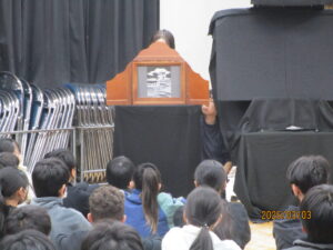 卒業する6年生のためのお別れ会を行ってくださいました。原子爆弾が投下された広島と長崎の惨状を二度と起こさないでほしいという願いの紙芝居、戦後の復興に向けた美空ひばりの歌をテーマにした影絵、トーンチャイムによる演奏の3部構成の会でした。最後に手作りのしおりもプレゼントしてくださいました。6年生の子どもたちはとても穏やかに観たり聞いたりしていました。6年間の最後にとてもすてきな時間をありがとうございました。