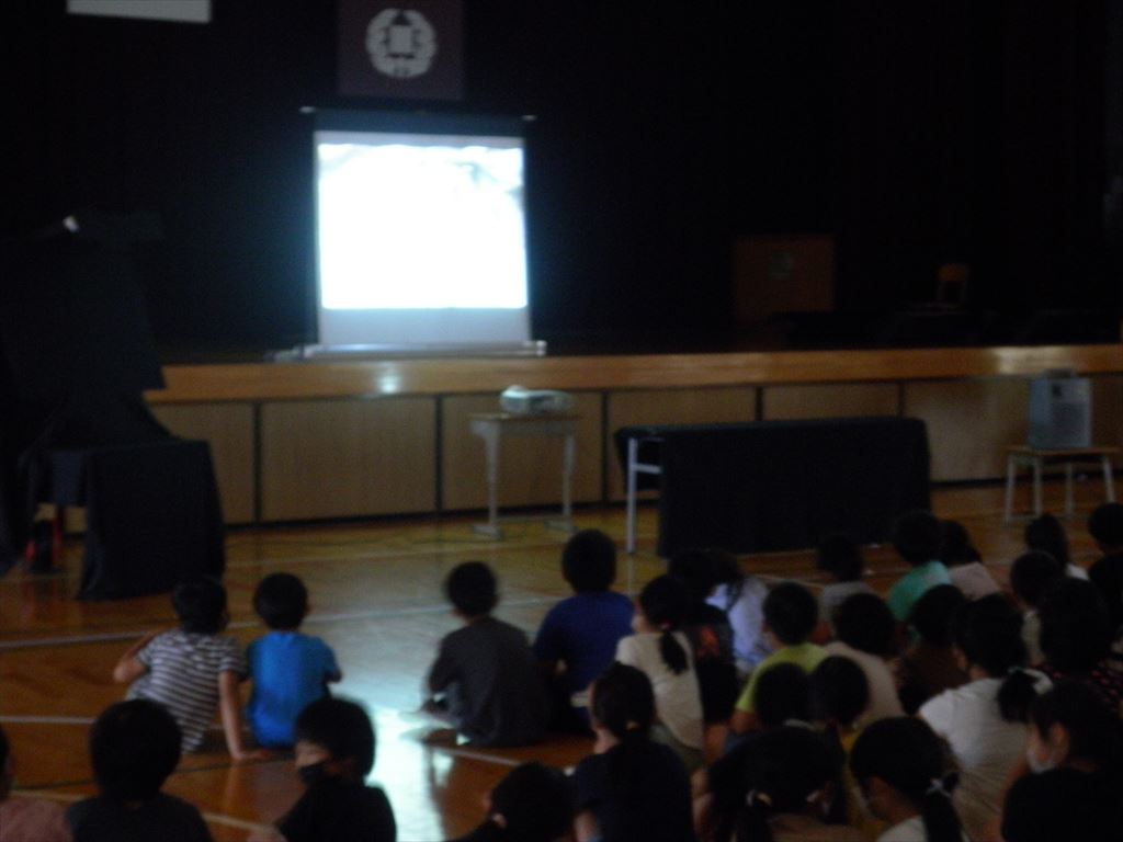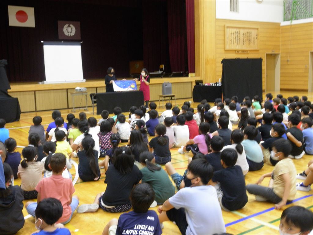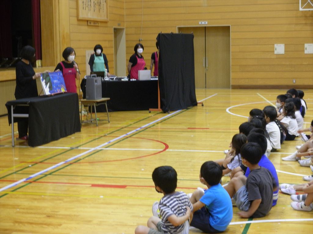 7月5日(火)いつもお世話になっている読み聞かせサークルの「ぐりとぐら」さんが、昼休みに体育館で七夕会を開いてくださいました。