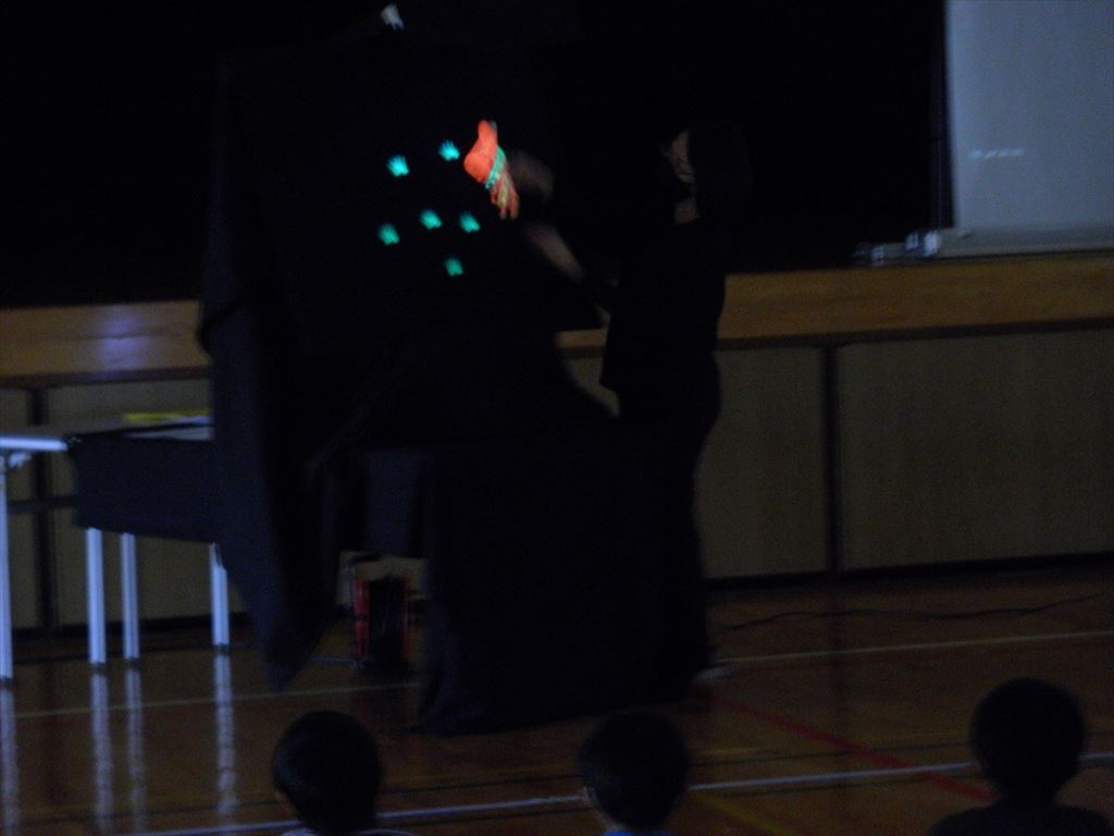 大型絵本を使った読み聞かせ、ブラックライトを使った読み聞かせ、さらにスクリーンを使った読み聞かせとさまざまな形で読み聞かせをしてくださいました。