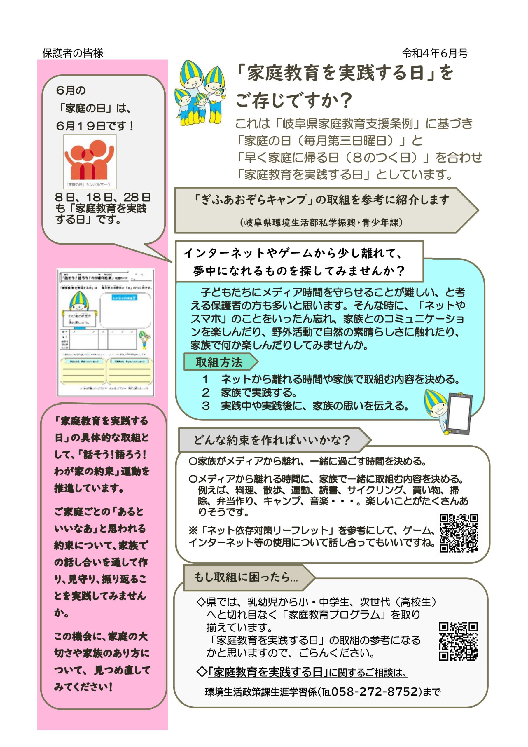 岐阜県では、「岐阜県家庭教育支援条例」の中で、「家庭の日(第三日曜日)」と「早く家庭に帰る日(8のつく日)」を、「家庭教育を実践する日」としています。「家庭教育を実践する日(家庭の日)」について意識する機会としていただきますようお願いします。