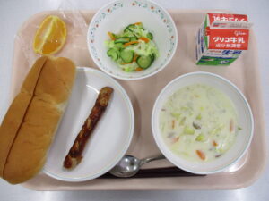 今日の献立は、切り目入りコッペパン、ロングウインナー、キャベツのサラダ、白菜とさつまいものシチュー、オレンジ、牛乳です。
