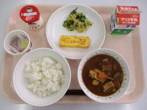 今日の献立は、麦ごはん、厚焼きたまご、ごまあえ、豚汁、納豆、ヨーグルト、牛乳です。