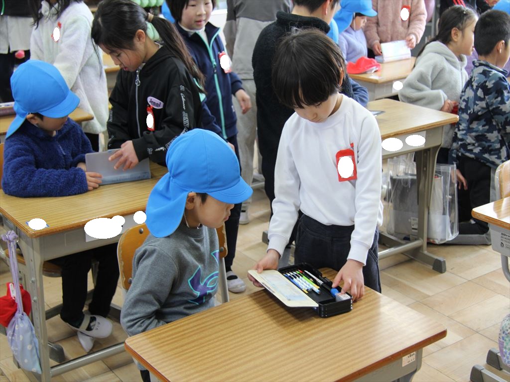 教室では、普段使っている学用品などを年長さんたちに見せて、説明しました。