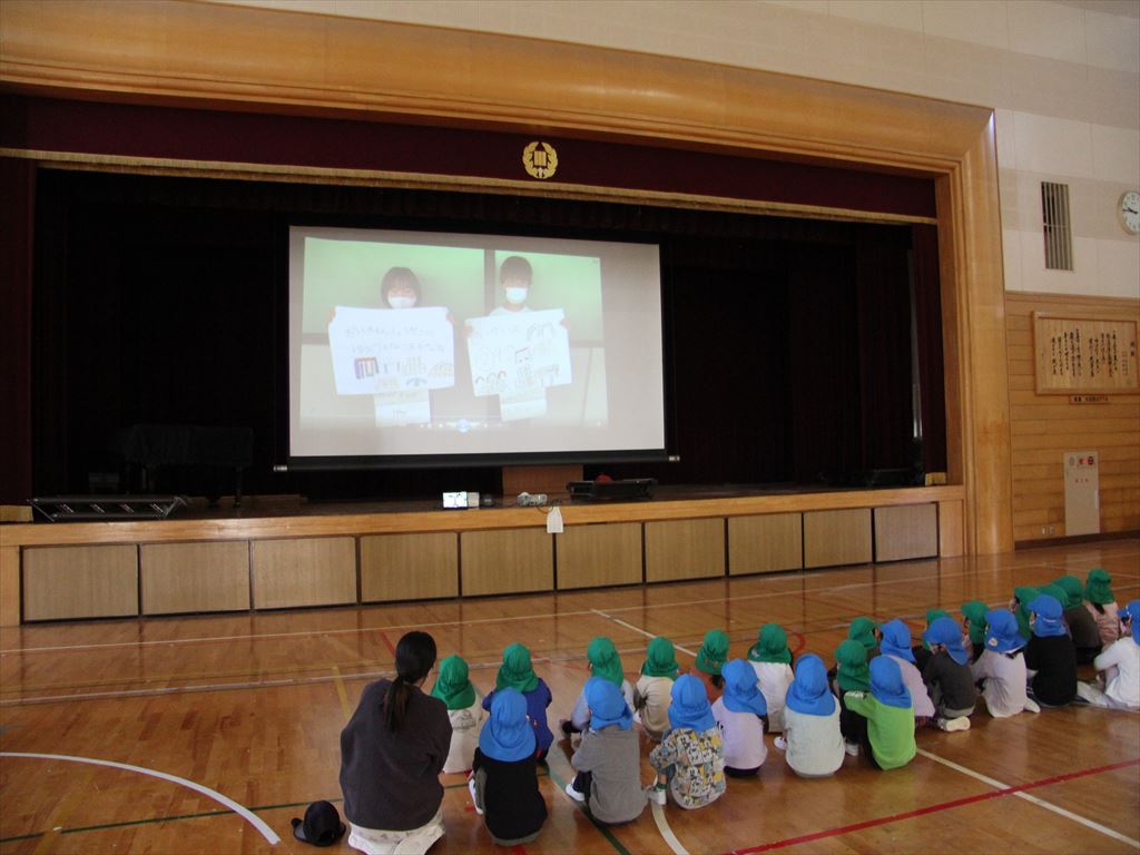 まず体育館で、1年生が事前に作った西小の紹介ビデオを年長さんたちに見てもらいました。