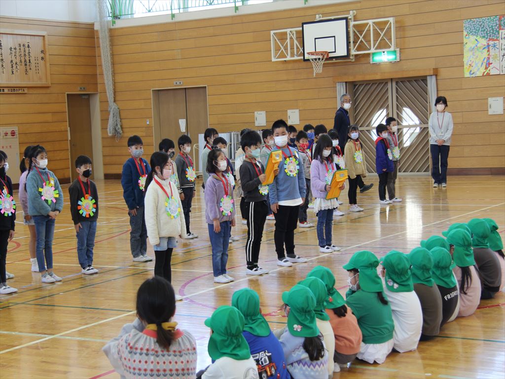 最後に、体育館で1年生が作ったメダルを年長さんたちにプレゼントしました。