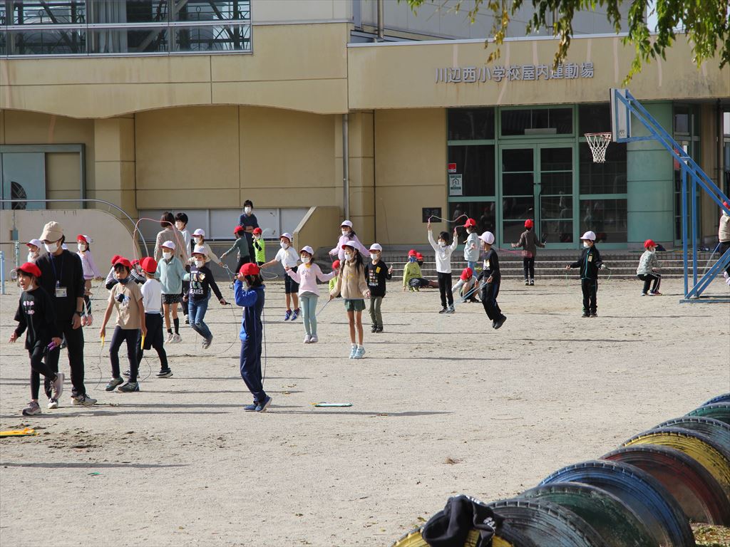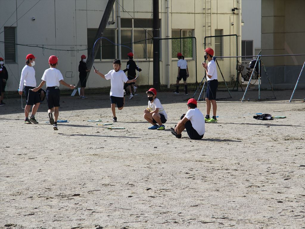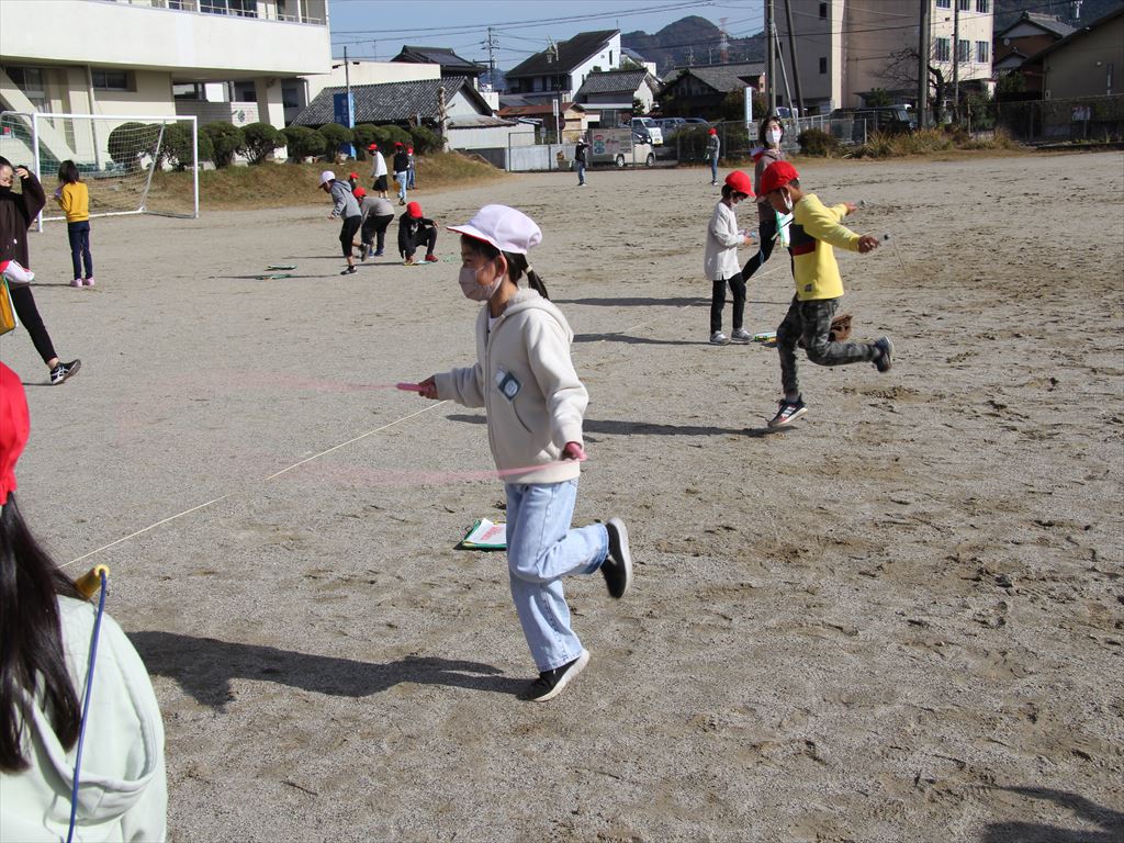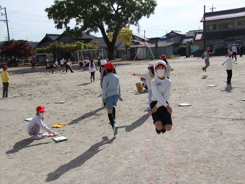 20分休みになると、全校児童が運動場に出てクラスごとに集まり、なわとび運動を始めました。一人一人がなわとびカードを見ながら、いろいろな技に挑戦しました。