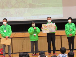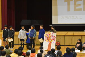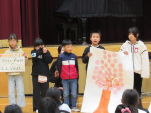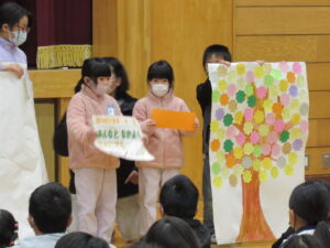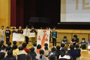 運営委員会を中心に、今年度は「笑顔の花を咲かせよう」をテーマに、各学級が仲間のよい姿を見つけたら、花の形のメッセージカードに書き、それを枯れ木の絵に張り付ける活動を行いました。すべてのクラスがメッセージカードの花をたくさん咲かせることができたことを集会で発表しました。また、川辺町人権擁護委員の皆さんからは会の様子を見た感想とSOSミニレターの紹介をしていただきました。人権意識を高める素敵な集会となりました。