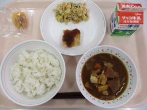 今日の献立は、川辺の新米ごはん、鶏肉のバーベキューソース、うの花煮、豚汁、柿、牛乳です。