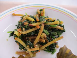 ほうれんそうのごま和えに、揚げたさつまいもを混ぜて、ほうれん草のカリカリ和えを作りました。