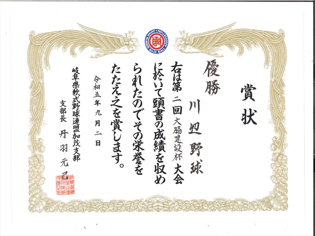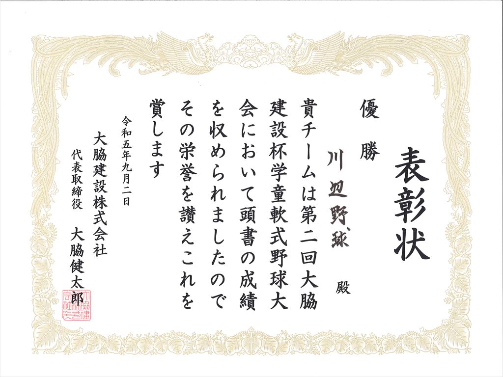 9月2日(土)に行われた「第2回大脇建設杯 学童軟式野球大会」で、川辺野球のみなさんが見事に優勝を勝ち取りました。
