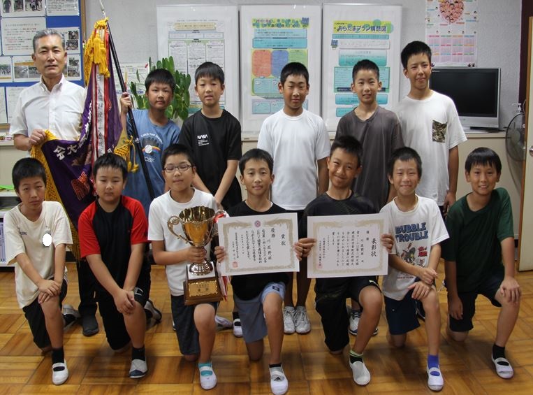 賞状、優勝旗、優勝カップを持って校長室に報告に来てくれた川辺野球のみなさんは、「次の大会でも優勝をめざし全力で取り組みます。」と力強く語ってくれました。