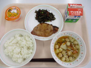 今日の献立は、麦ごはん、豚肉の生姜焼き、ひじきの煮つけ、白玉麩のおばけスープ、かぼちゃデザートです。