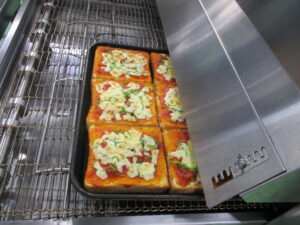 厚切りの食パンにサラミをのせてピザソースを塗り、ピーマンとチーズをのせて、オーブンで焼きます。
