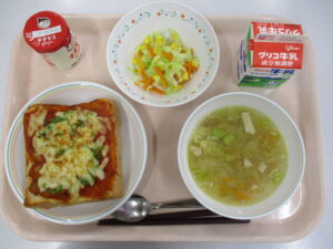 今日の献立は、ピザトースト、野菜サラダ、コンソメスープ、ヨーグルト、牛乳です。