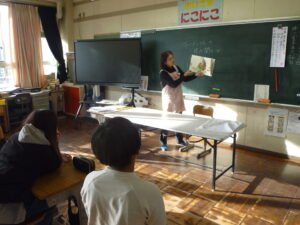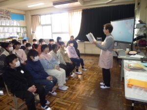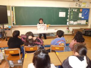 その後は、各教室での読み聞かせです。まず始めに、川辺の昔話「蛇ヶ谷伝説」を読んでくださいました。ブレーメンさんの話では、子どもの頃、実際に蛇ヶ谷に行ったことがあるとのことでした。続いて、各学年向けに選んでくださった本を読んでくださいました。ブレーメンの皆さん、1年間、素敵な本の世界に連れて行っていただき、ありがとうございました。