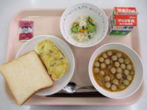献立は、米粉入り食パン、マーシャルビーンズ(チョコクリーム)、ポテトグラタン、切り干し大根と糸こんにゃくのサラダ、ミネストローネ、牛乳です。