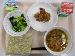 今日の献立は、五目ラーメン、鶏肉の唐揚げ、海藻入りサラダ、ヨーグルト、牛乳です。