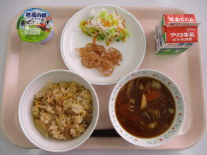 今日の献立は、キムチチャーハン、れんこんチップ、春雨サラダ、豚汁、ヨーグルト、牛乳です。