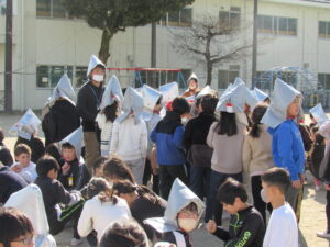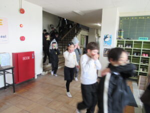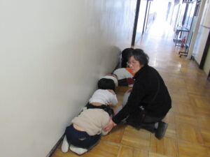 2月9日(月)昼の掃除の時間に児童及び学校職員へ事前予告なしの「命を守る訓練」を行いました。児童がそれぞれの掃除場所で活動している時に、地震が発生し音楽室から出火したことを想定して行いました。子どもたちは学校職員の指示がない中での避難であるとともに、行方不明の児童が2名いることで、学校職員が捜索することも行いました。また、実際に消防署へ119番通報することも行いました。突然の避難訓練でしたが、真剣に取り組むことができていました。
