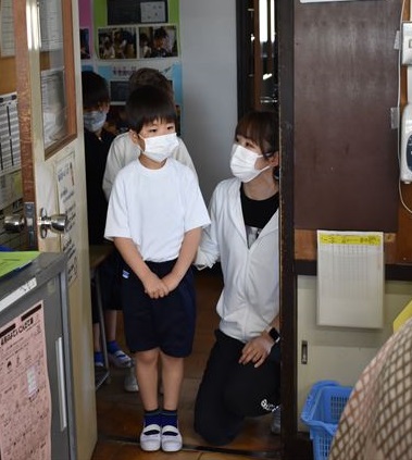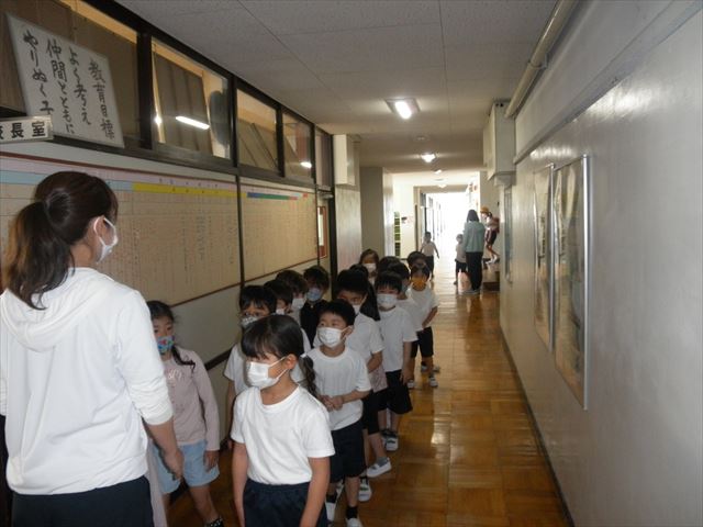 1年生は、小学校での生活が始まって3週間目となり、学校内にどんな部屋があるのか探検しました。校長室・職員室の前で静かに並んで待ち、職員室の入り方も練習しました。