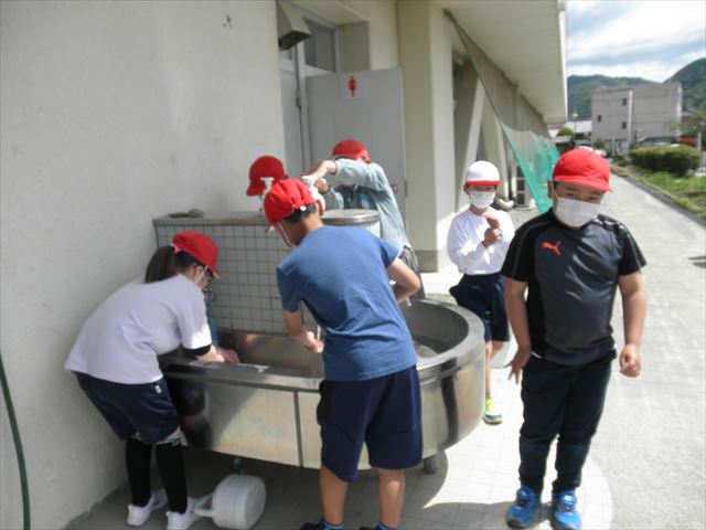 運動場で遊んだ後は、手洗いも忘れずに行っています。
