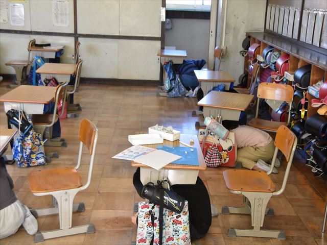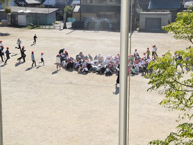 命を守る訓練として、休み時間中に緊急避難練習を実施しました。放送の音声と同時に机の下にもぐる子どもたち、グラウンドの中央に集まる子どもたち、活動場所によって動きを変える子どもたちでした。