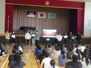 冬休み前の最後の児童集会。今回は、保健給食委員会による「正しい手洗いの仕方」の実技発表と、サッカーの全国大会に出場する仲間の壮行会を行いました。冬休みまであと2週間あまり。最後までやりきって冬休みを迎えることができるように頑張ります。