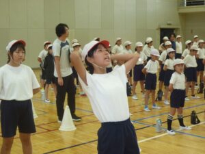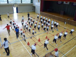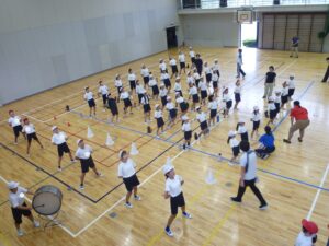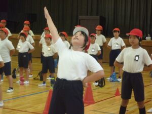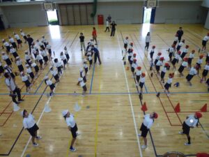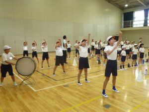 今日の午前中は、あいにくの雨。本来なら、青空の時間に運動場で全体エール練習を行う予定でしたが、急遽変更となり体育館で実施しました。本番さながらに、赤団・白団が向き合ってのエール交換は、お互いの声がぶつかり合う迫力ある光景でした。運動会まで、あと10日。さらに気持ちを高め、本番でも今日の体育館くらい、いや、もっともっと「出し切る運動会」にしましょう。
