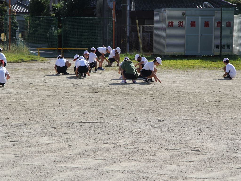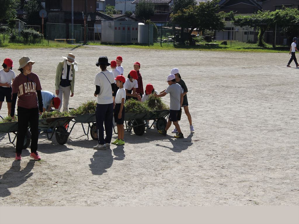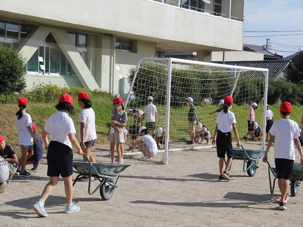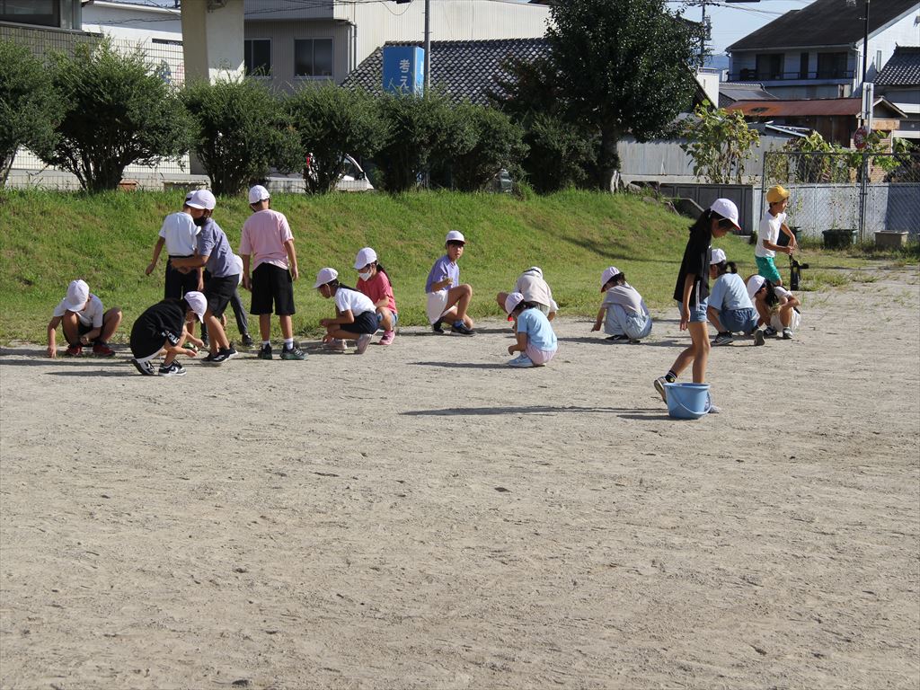 9月25日(月) 朝の活動の時間に、全校で運動場の草取りと石拾いを行いました。