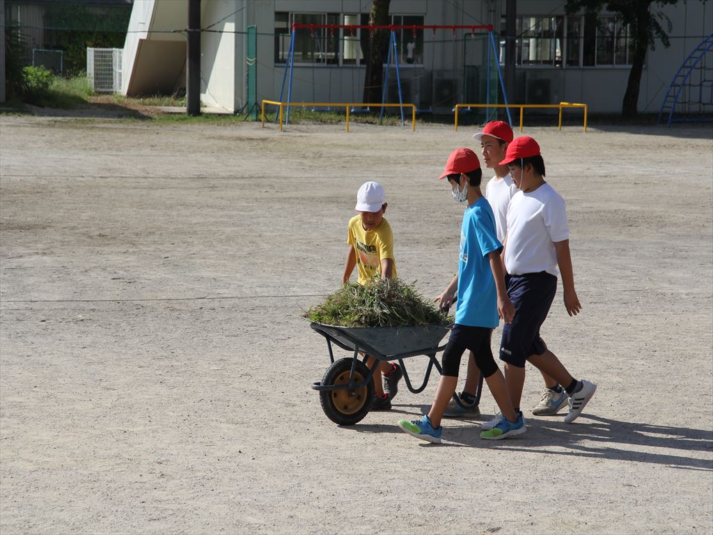 高学年が中心となって一輪車で草を集めました。