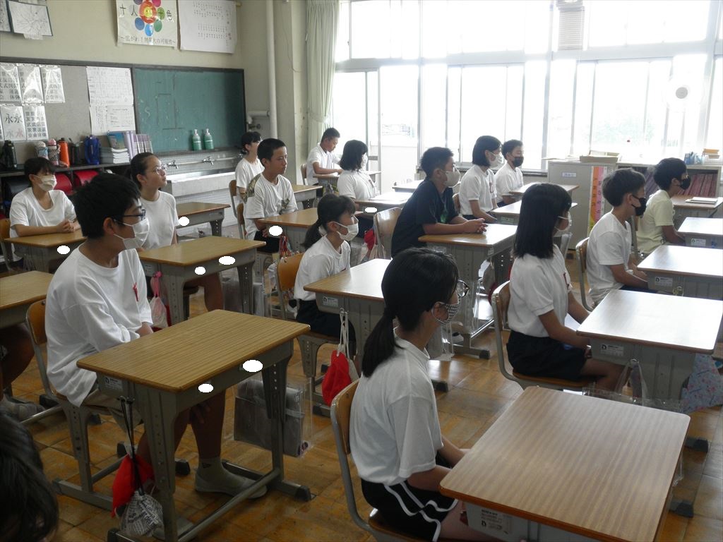 この時期、体育館内は非常に暑くなるため、全校で集まることをやめ、リモートで各教室をつなぎ行いました。
