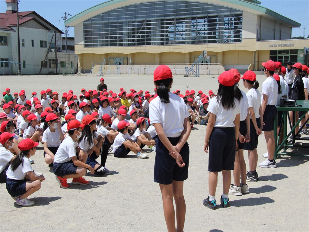 朝礼台前に全校が集まりルールの確認をしました。