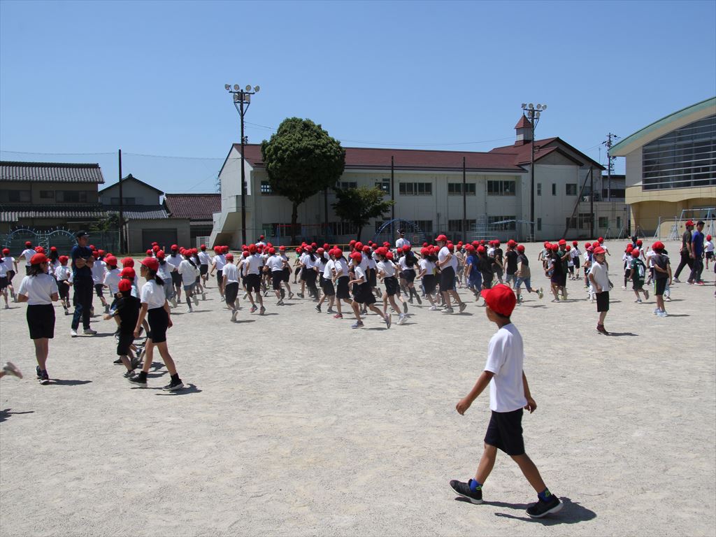 最後まで赤色帽子のまま逃げ残った子は、全校の前で紹介されました。