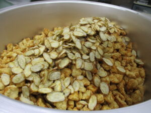 しょうゆなどの調味料を入れて味付けし、最後にごまを混ぜます。