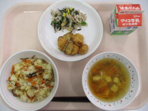 今日の献立は、人参ごはん、鶏とごぼうの甘辛、れんこんサラダ、豆腐のすまし汁、牛乳です。